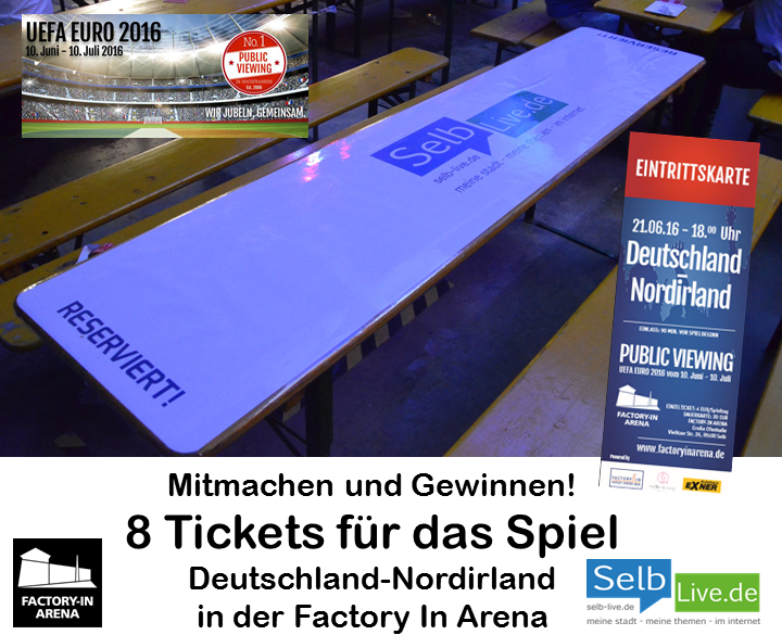 Einen Tisch für acht Personen hat selb-live.de als Partner des „Public Viewing 2016“ bereits wieder reserviert. Die Tickets hierzu verlosen wir natürlich wieder unter unseren Lesern. Mitmachen ist ganz einfach. Gehe HIER auf unsere Facebook-Seite, markiere da unter unserem EM-Gewinnspielhaupteintrag genau die sieben Freunde, mit denen Du in der Factory In Arena das Spiel Deutschland-Nordirland erleben möchtest. Unter allen Teilnehmern wird dieses Ticket-Paket einmalig verlost… Teilnahmeschluss ist am 20. Juni 2016 um 12:00 Uhr, der Rechtsweg ist ausgeschlossen.