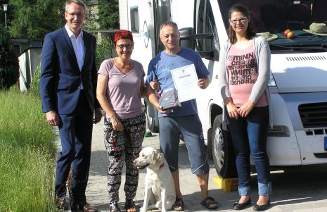 28.6.2016 – Der Wohnmobilstellplatz am Papiermühlweg in Selb erfreut sich seit seiner Eröffnung im Oktober 2013 großer Beliebtheit. Oberbürgermeister Uli Pötzsch und Wirtschaftsförderin Nadja Hochmuth freuten sich nun, dass sie das mittlerweile 1.500 Wohnmobil auf dem Platz
